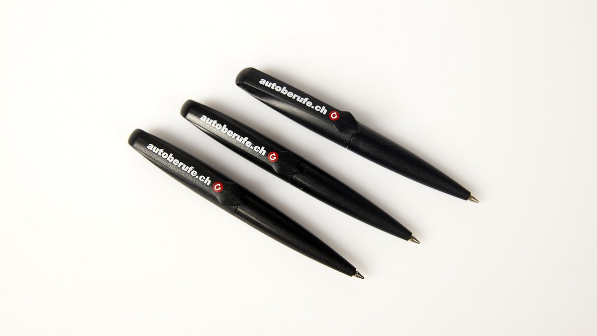 Kugelschreiber "Ascona" in schwarz mit 2-farbigem, 1-seitigem Druck des autoberufe.ch Logos auf dem Schaft in rot und weiss. Blau-schreibende Miene.