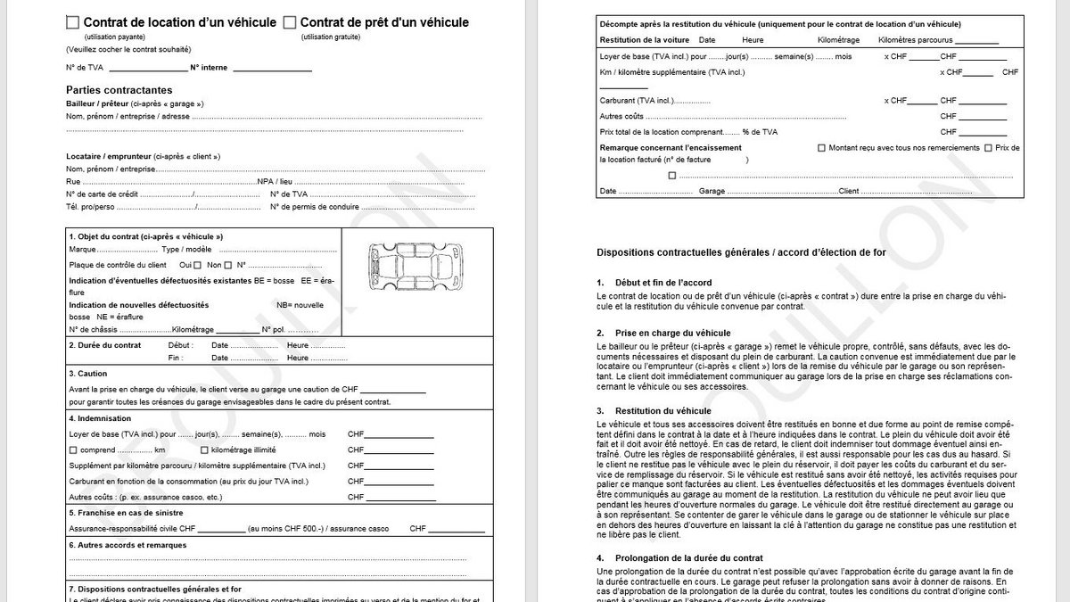 Modèle électronique pour remplir un contrat de location d'un véhicule / contrat de prêt d'un véhicule (format de fichier : Microsoft Word)