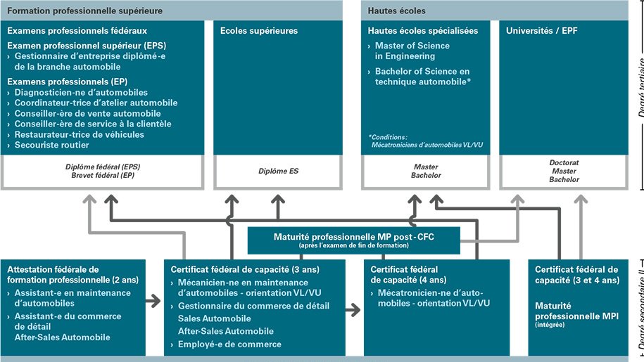 Vue d'ensemble graphique qui montre les différentes possibilités de formation initiale ou continue dans la branche automobile.