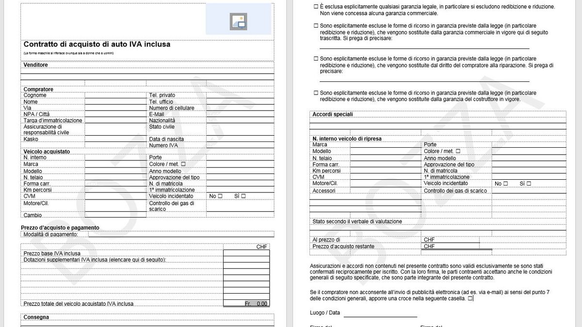 Modello elettronico per riempire un contratto di acquisto di auto (IVA incl.) (formato del file: Microsoft Word)