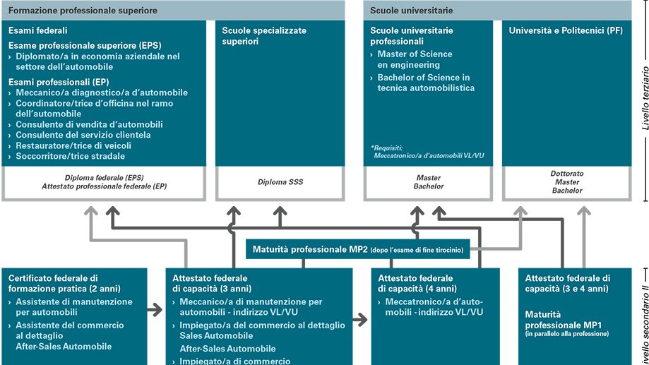Panoramica grafica delle diverse possibilità di formazione iniziale e continua nell'industria automobilistica.